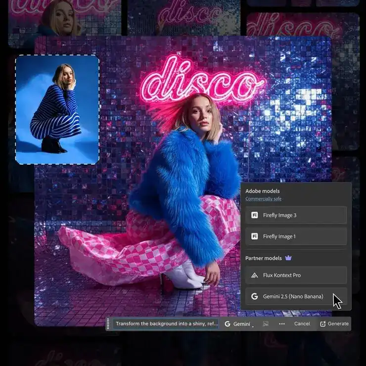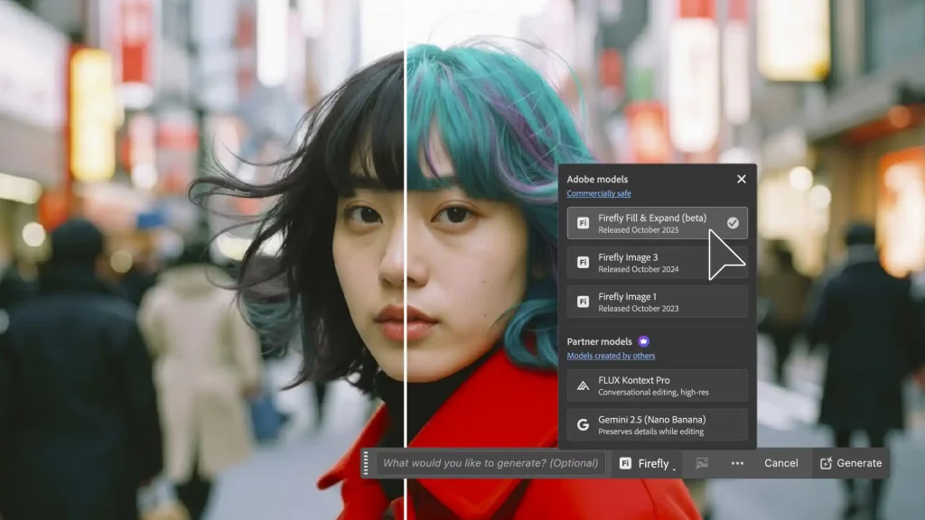 「生成塗りつぶし」機能に新しいパートナーAIモデルが追加され、作成したいプロンプトやシーンに応じて、最適なモデルを選択できるようになりました。
