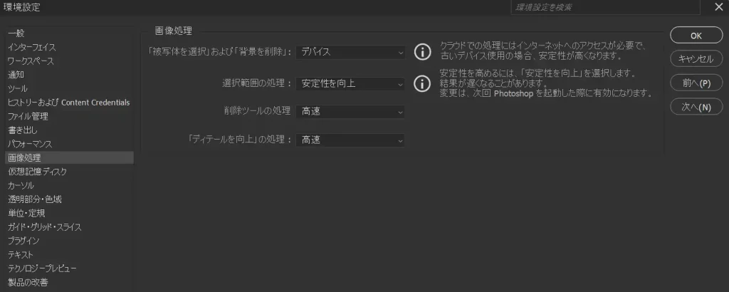 メインメニューから、設定/画像処理(macOS)または編集/環境設定/画像処理(Windows)の順に選択し、環境設定ダイアログボックスで、「被写体を選択」および「背景を削除」ドロップダウンから、デバイスを選択することができます。