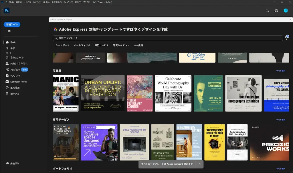 Photoshopのホーム画面から、SNS投稿、ポスター、チラシなどに活用できるAdobe Expressのテンプレートを参照・選択できるようになりました。