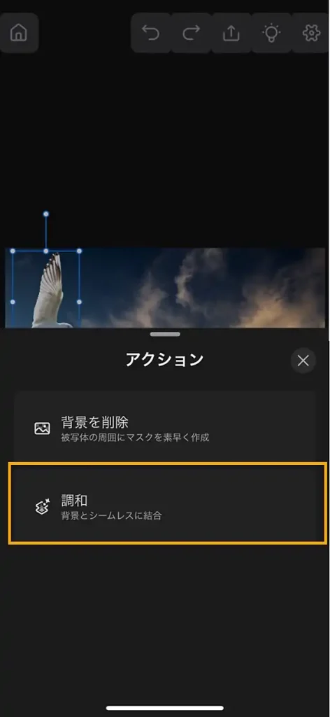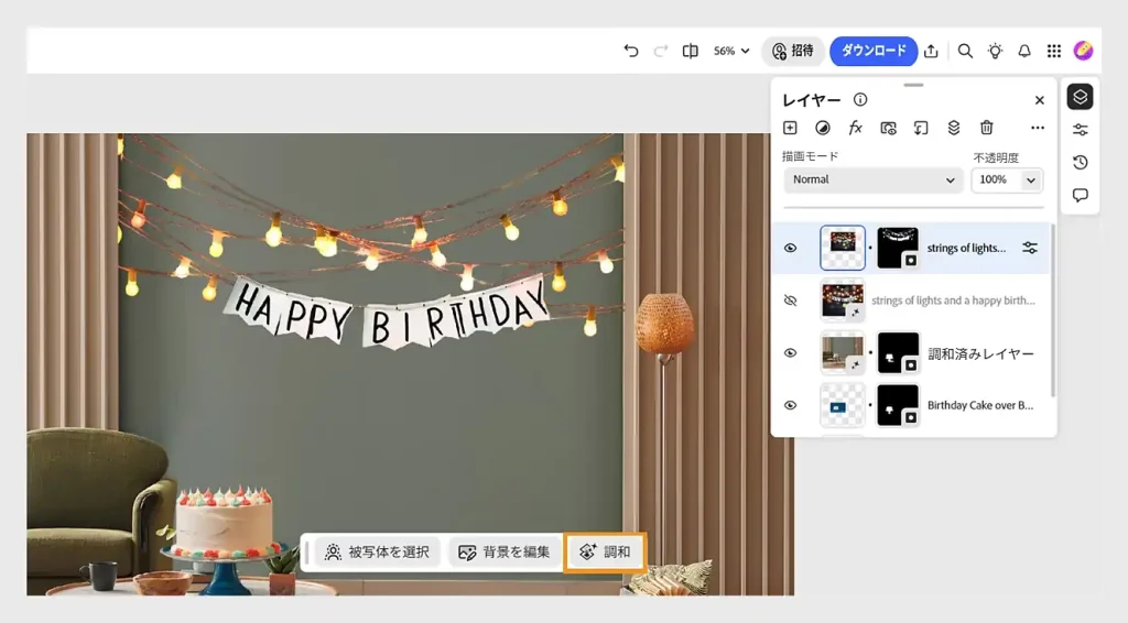 新たに搭載された「調和」機能により、合成画像のライティング、カラー、シャドウといった詳細を微調整し、よりリアルな仕上がりを実現できます。