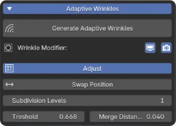 通常、Merge Distance(結合距離)はデフォルトのままで問題ありませんが、スケールが大きく異なる場合は調整することでシェーディング品質を向上させることが可能です。 Subdivision Levelsは、シワの内部に特別なディテールが必要な場合にのみ使用する設計となっており、不要な計算負荷を避けることができます。