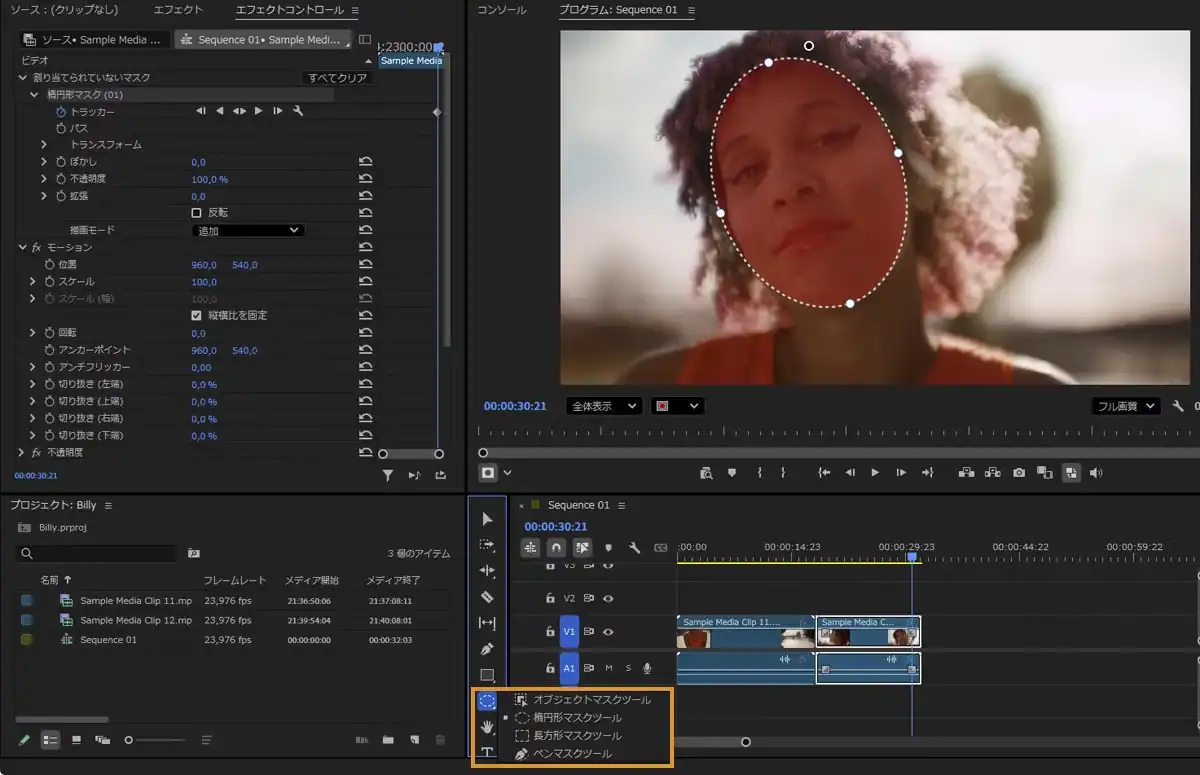 これらのツールはエフェクトコントロールパネルと密接に統合されており、寸法・位置・回転・パスのプロパティを数値で微調整できます。マスク作成から調整までを一つの統一されたインターフェイスで完結できるため、編集作業がより予測可能で正確になります。