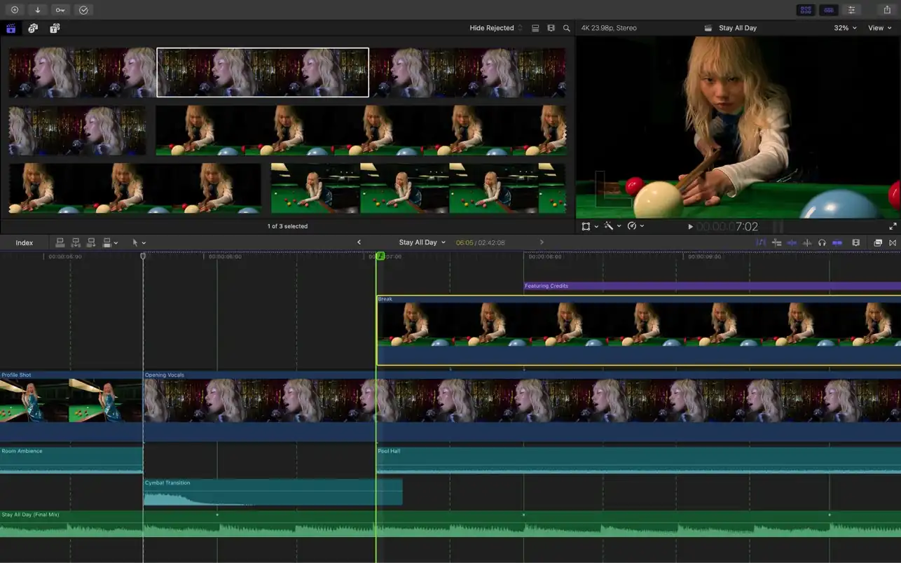 - インスペクタの複数選択対応:タイムライン上で複数のクリップを選択し、インスペクタで一括してパラメータの調整や変更を行えるようになりました。これにより、色補正やオーディオ設定などの繰り返し作業が大幅に効率化されます。