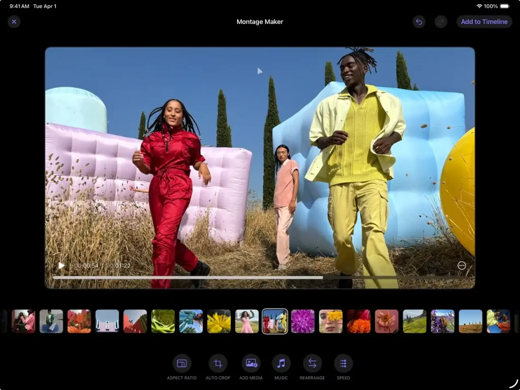 モンタージュメーカーを使用すると、プロジェクトからメディアを選択するだけで、モンタージュメーカーが視覚的なハイライトを自動的に特定し、選択した楽曲のビートに合わせて編集されたシーケンスを作成することができます。