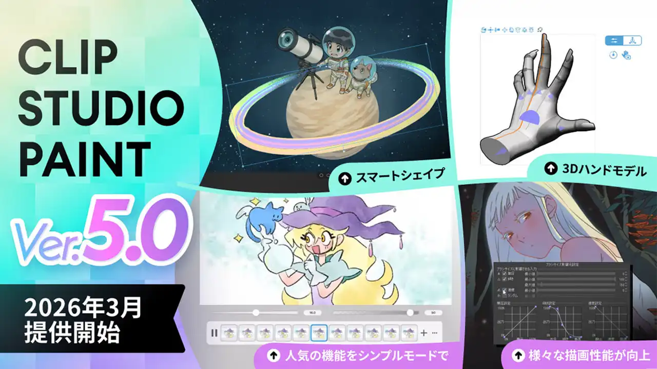 2026年3月11日 – セルシスは、ペイントツール「CLIP STUDIO PAINT EX/PRO」の最新バージョンとなるVer.5.0.0(Windows版 / macOS版 / iPad版 / iPhone版 / Android版)を公開しました。