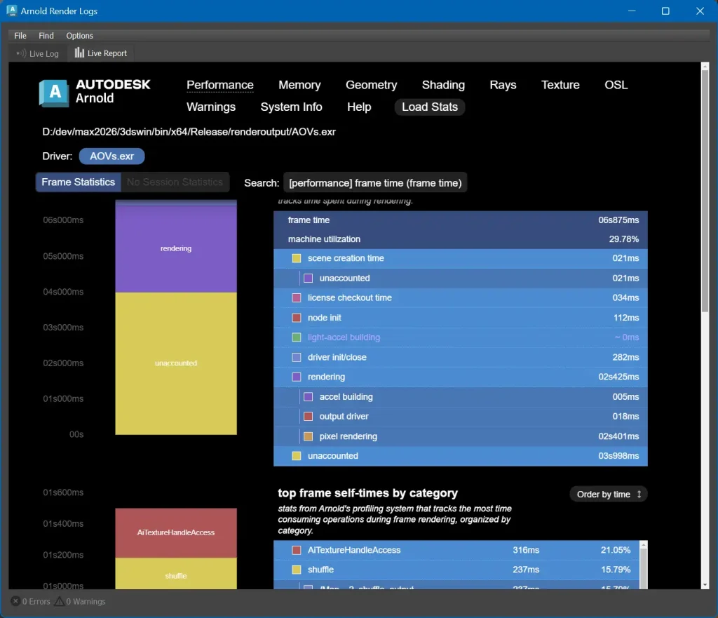 Arnold RenderViewに新しく「Live Report」タブが追加されました。このタブでは、Arnoldのログやレンダリングの統計情報をグラフィカルかつインタラクティブに確認することができます。インタラクティブレンダリングの進行に合わせてデータがリアルタイムに更新されるため、簡単にパフォーマンスの分析ができます。