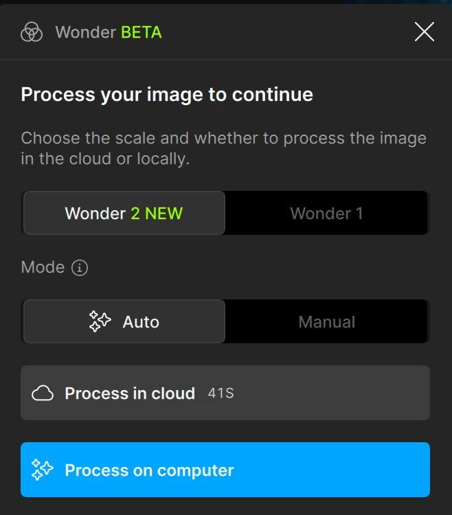 そこで今回のバージョンでは、Autopilot の解析プロセスに新しい検知モデルが追加され、低ディテールや偽解像度の状態を自動的に見分けられるようになっています。低ディテールや偽解像度が検出されると、Wonder 2を使用する際に自動的に「Auto Mode」が選択されます。