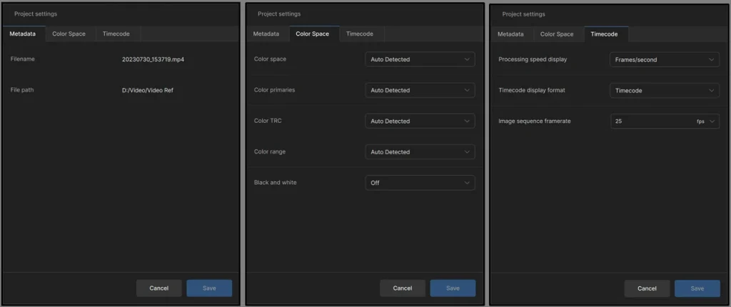 「File」メニューには新しいプロジェクト設定ダイアログが追加され、これまで使用されていた入力設定パネルを完全に置き換える形になりました。プロジェクト全体の入力カラースペースやモノクロ指定、タイムコードの扱い、連番画像のフレームレートなどを、このダイアログからまとめて管理できるようになり、作業の入り口がより分かりやすく整理されています。