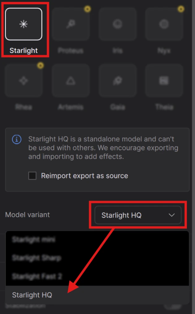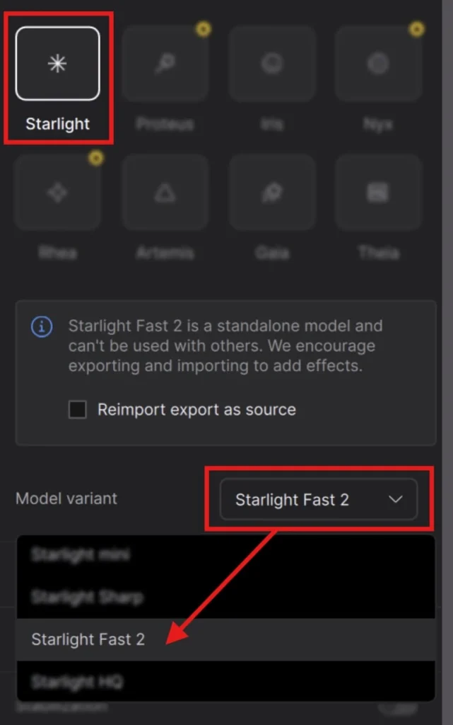 モデルの性質としては Fast 2 と近い目的を持ちながら、全体的により高品質な結果を提供します。処理速度は Starlight Mini とほぼ同等で、時間をかける分だけ細部のディテールがしっかり再現されます。クラウドアクセスやクラウドエクスポートは、すべてのサブスクリプションモデルで利用できるため、環境に依存せず安定した品質を求めるワークフローに向いています。