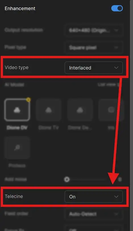 - テレシネの移行: テレシネ設定が右パネルの「Interlaced(インターレース)」エンハンスメント内に移動し、より直感的にアクセスできるようになりました。