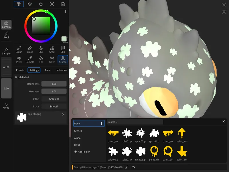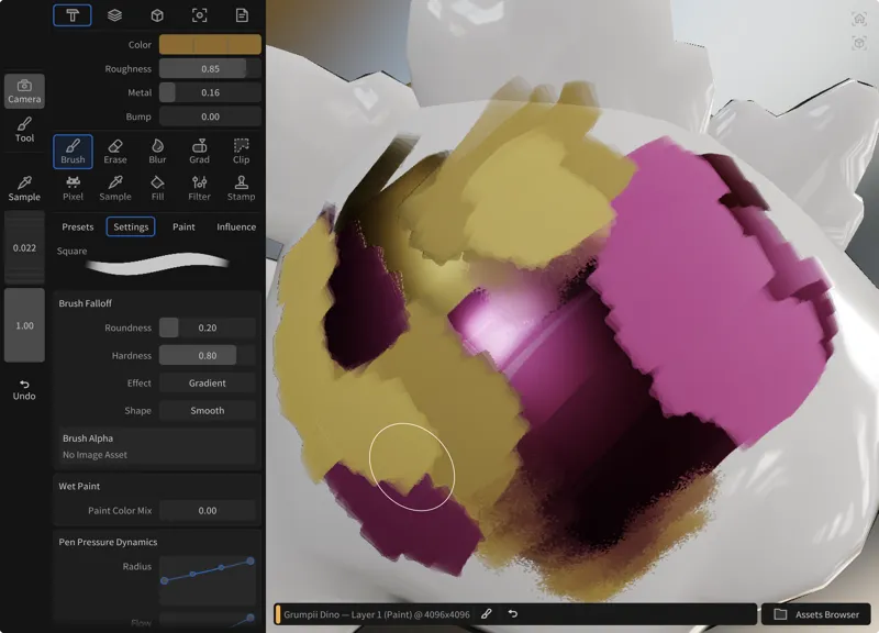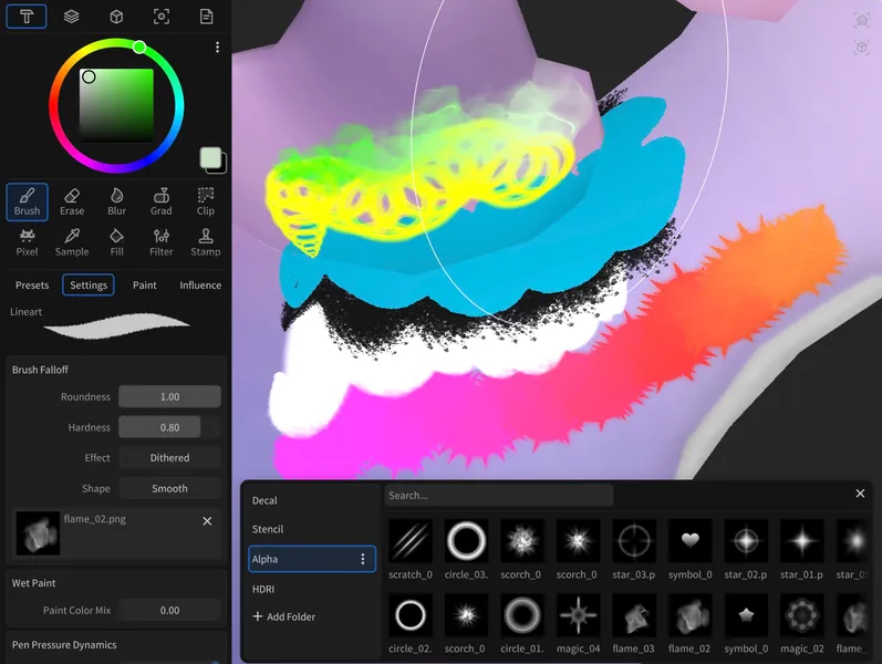 ワールド空間で計算される球状・プリズム状のブラシ減衰により、真の 3D ペイントを実現しています。