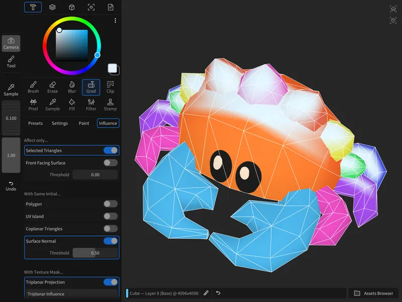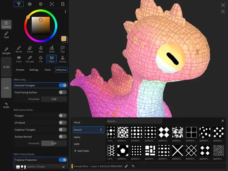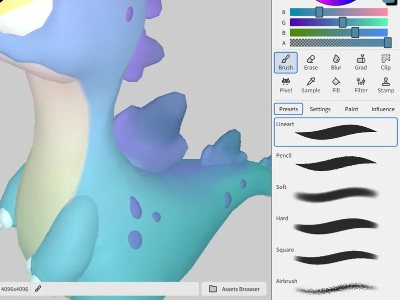 さらに、2018 年の iPad Pro(第 3 世代)では 24K テクスチャ(4K タイル×36 枚)のペイントにも対応。古いハードウェアでも、ピクセル単位の正確なコントロールやレスポンスの良いブレンディングを維持しながら、ステンシルやアルファを使った細かなディテールまでしっかり描画できます。