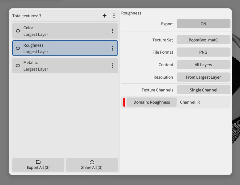 カラー、ラフネス、メタルネスなど複数のPBRチャンネルを一度のストロークで同時に描画できます。