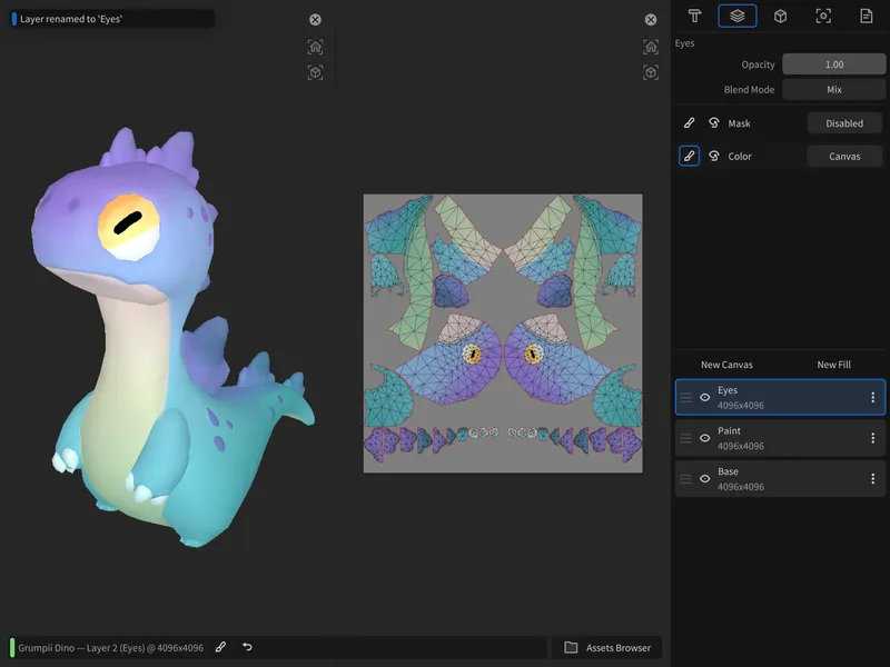 3D と 2D のどちらでもペイントでき、両ビューは常に同期して動作します。ライティングなし、シェーディングあり、PBR プレビューといった 3D メッシュ上でのペイントに加えて、展開された 2D テクスチャ上で直接作業することも可能です。