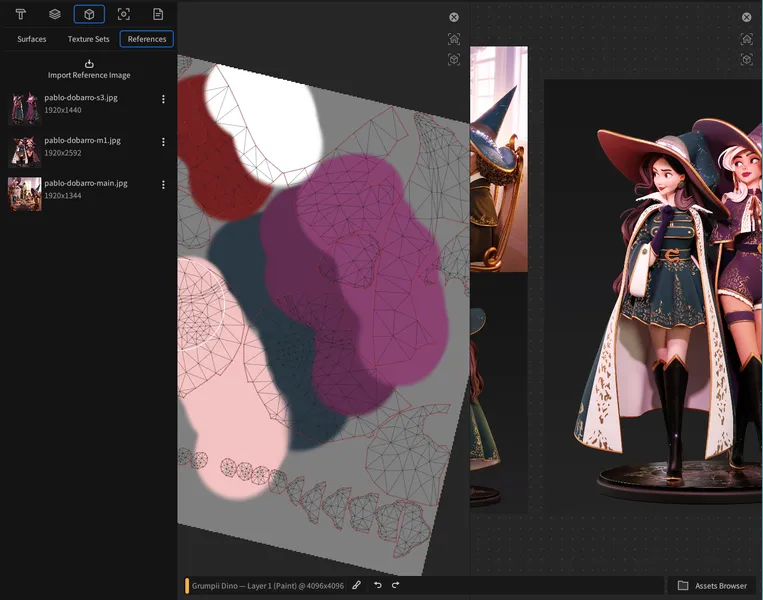 参考画像を第2のビューポートとして固定し、作業画面内に配置できます。リファレンス画像から直接色をスポイトで取得することも可能です。