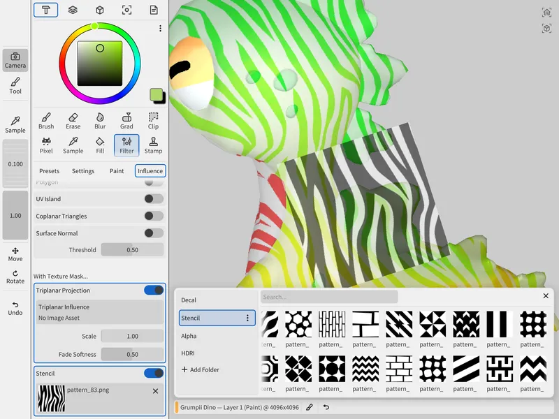 統合アセットブラウザでは、テクスチャ、ステンシル、ブラシアルファ、HDRI、デカールなどをひとつのパネルでまとめて閲覧でき、そのままツールへ即座に適用できます。