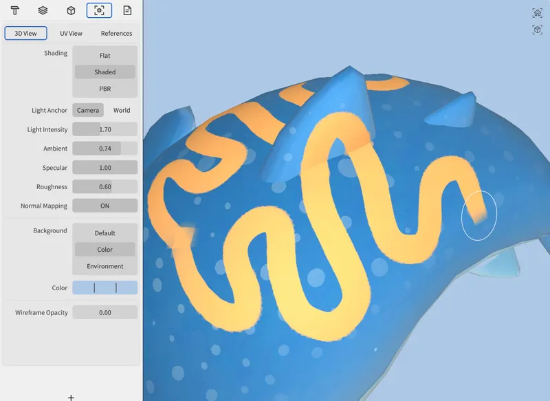 一般的なイラストレーションソフトウェアで期待されるツールやレイアウトが、3Dモデルの表面に直接適用できるよう設計されています。