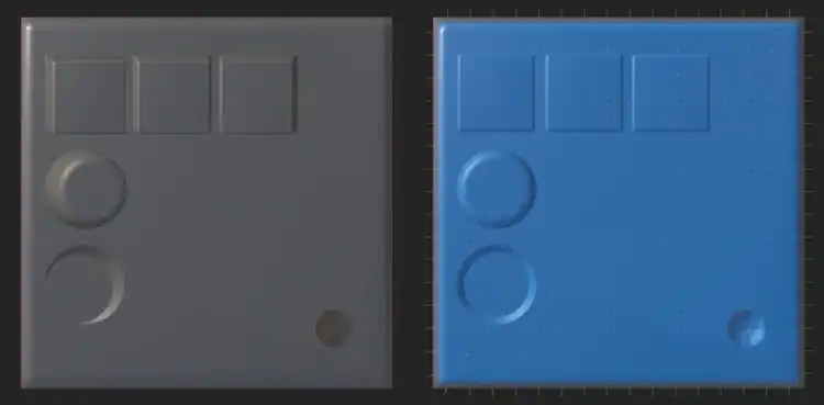 上図左側のメッシュは、ハードエッジ付近の法線のずれにより目に見える歪みが生じています。右側はスキューマップをペイントした同じメッシュです。歪みが解消され、エッジ保護機能によってエッジ付近以外の法線がサーフェスに対して垂直に保たれていることがわかります。