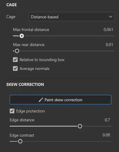 「Cage(ケージ)」設定を「Distance-based」にした状態で、Skew correction(スキュー補正)項目の「Paint skew correction」を選択すると、ローポリメッシュ上へのペイントを開始できます。