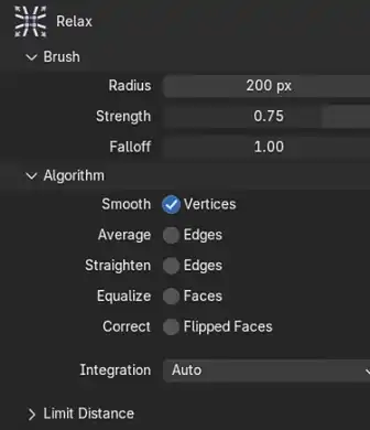 ただし、単独で使用した場合は角度や形状の流れといった要素を考慮しないため、エッジに逃げ場がない箇所ではメッシュがねじれることがあります。そのため、このオプションは単体で使うのではなく、後述の 「Smooth Vertices」「Straighten Edges」「Equalize Faces」 などと組み合わせて使用することが推奨されています。