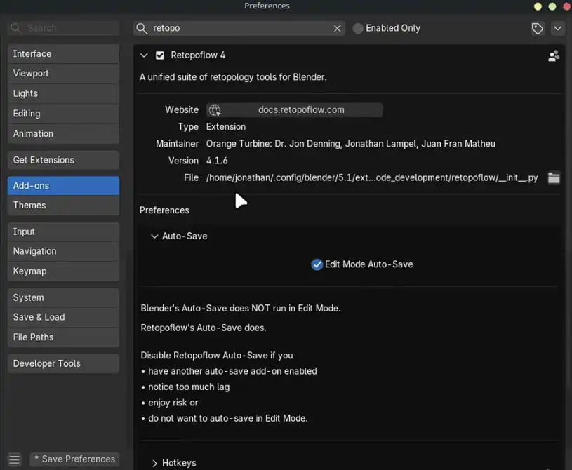 今回、アドオンの環境設定に新たに「Autosave」セクションが設けられ、「Edit Mode Autosave」オプションが追加されました(デフォルトで有効)。※ 既に編集モード用の別のオートセーブアドオンを使用している場合は、競合を避けるためにこの機能を無効(チェックを外す)にすることも可能です。