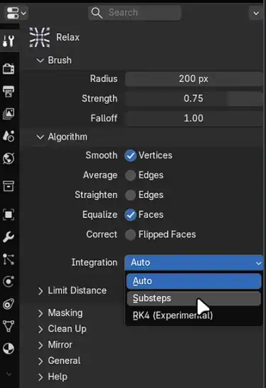 設定パネルの下部へ移動した 「Integration」オプション は、計算精度を調整するための項目です。ただし、基本的にはユーザーが手動で変更する必要はなく、通常の作業ではデフォルトのままで問題ありません。