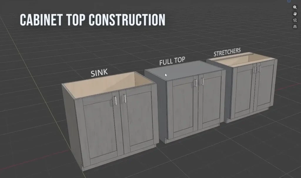ベースキャビネットの上部構造について、「Sink(シンク用)」「Full Top(全面パネル)」「Stretchers(補強桟)」の3種類から選択できるようになりました。