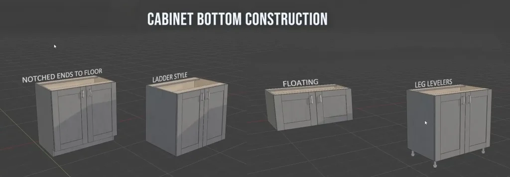 ベースキャビネットおよびトールキャビネットの台座部分については、「Notched ends to floor(側板が床まで伸びる切り欠きタイプ)」「Ladder style(はしご状の台座)」「Floating(壁掛け・フロート)」「Leg levelers(高さ調整脚)」の4種類から選択可能になりました。