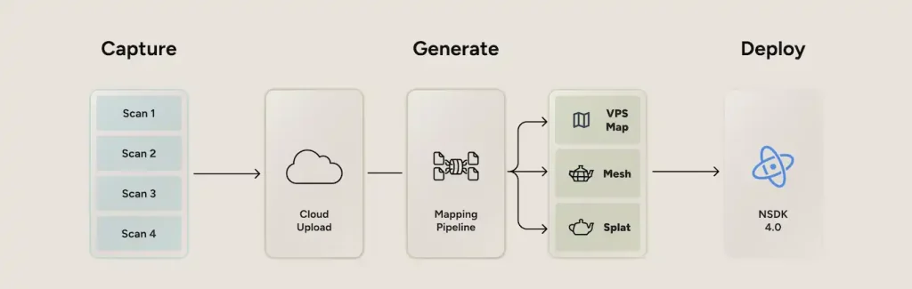 NSDK 4.0は、ScaniverseとVPS 2.0に直接接続する「統合SDK」として機能します。これにより、Scaniverseで作成したプライベートなマップや3Dアセットを、開発者自身のアプリケーションに直接読み込み、VPS 2.0の測位機能と連携させることが可能になります。