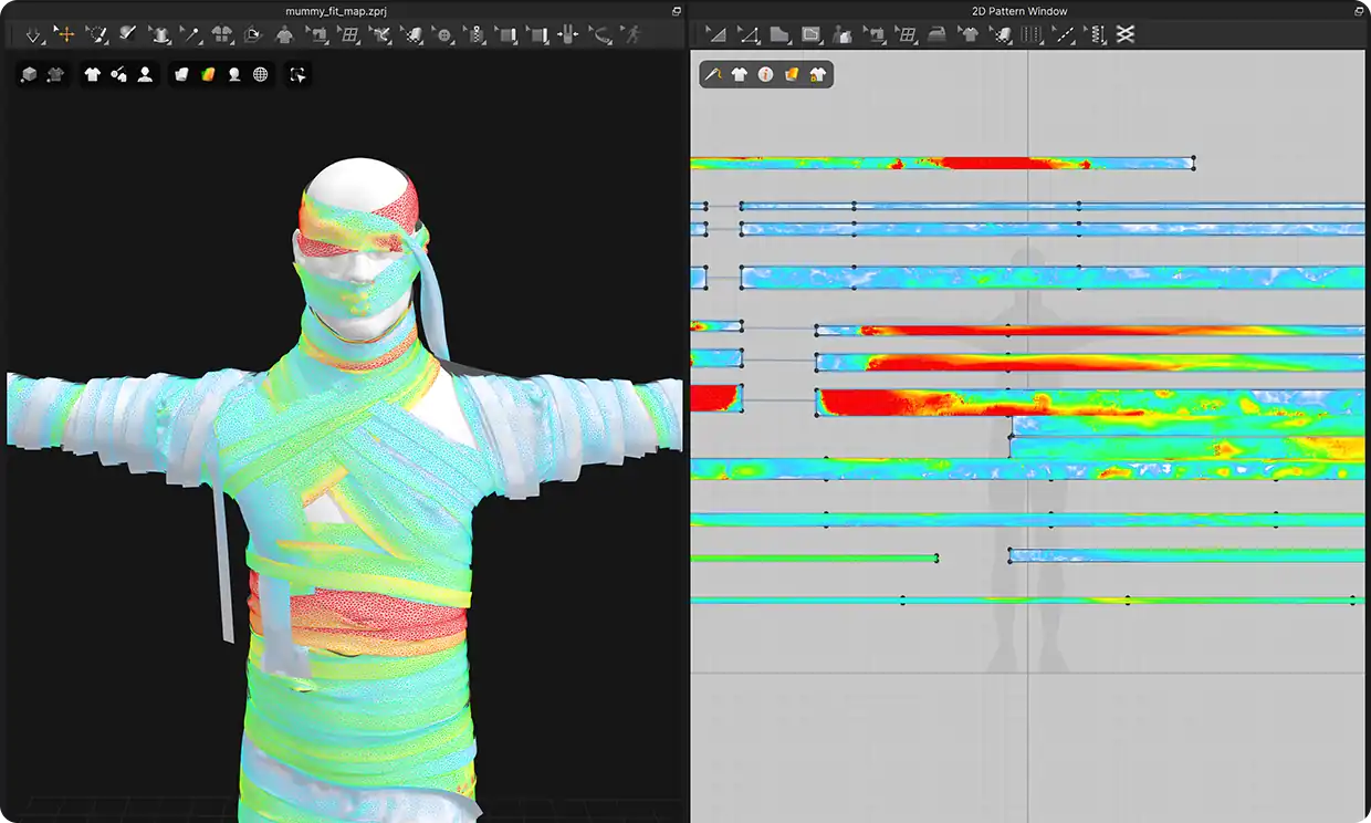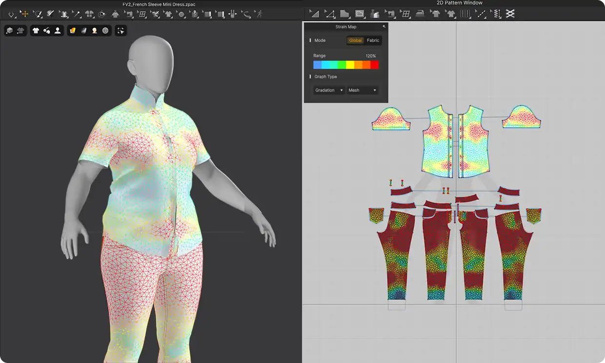 衣装の張力やフィット具合を、2Dパターン上でも直接視覚的に確認できる機能が追加されました。