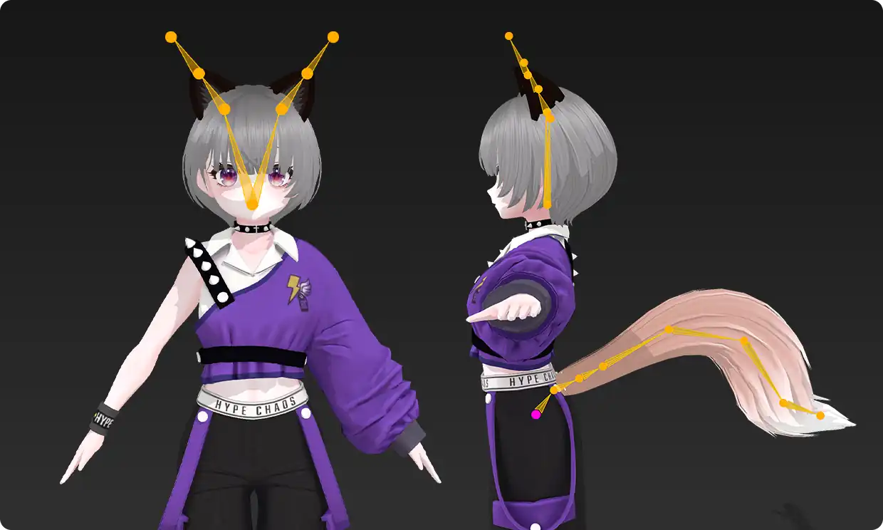 例えばスカートに適用するだけで、VRChatのPhysBonesなどの揺れものセットアップに適した安定したボーン構造を自動で構築することができます。現在はスカートのみの対応ですが、ゲームエンジン内での手動によるウェイト修正の手間を大幅に削減し、よりスムーズなキャラクターセットアップを実現することが可能です。