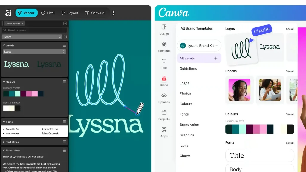 Affinity内でCanva Brand Systemのブランドアセット(カラー、フォント、ロゴ)を直接利用し、一貫性のあるデザインワークフローを実現。