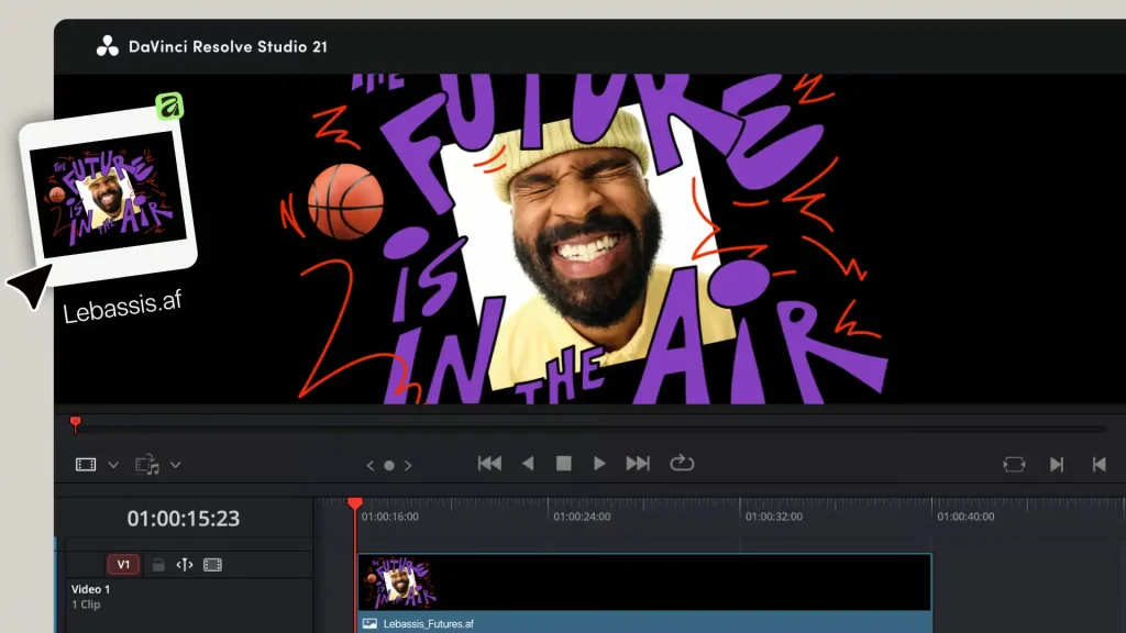DaVinci Resolveのタイムラインに配置されたAffinityのデザインファイル。ライブアップデートによりリアルタイムに同期される。