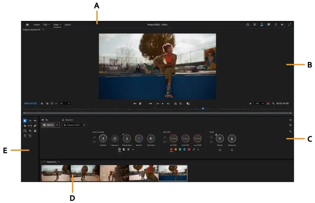 A. Premiere (ベータ版) ヘッダー   B. カラーモニター   C. カラーコントロール   D. クリップグリッド   E. ツールバー