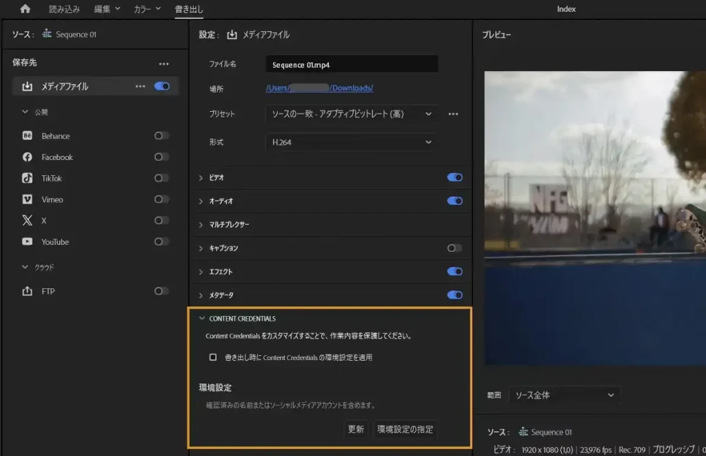 4. 「書き出し時に Content Credentials の環境設定を適用」を有効にし、残りの書き出し設定を指定します。
