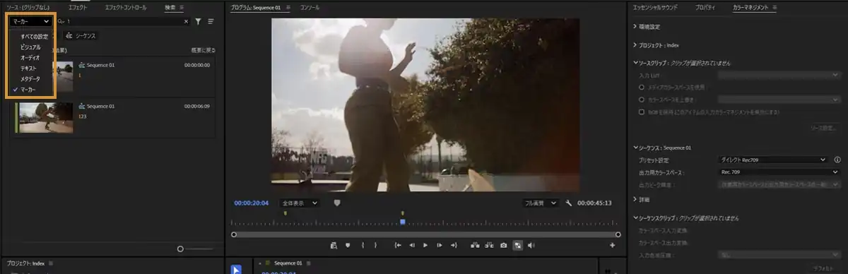 検索結果のマーカーをダブルクリックすると、ソースモニターまたはタイムライン内の該当位置へ再生ヘッドが瞬時に移動します。範囲マーカーの場合は、その開始位置にジャンプします。また、複数のマーカー結果を選択してシーケンスにドラッグし、タイムラインへ追加することも可能です。