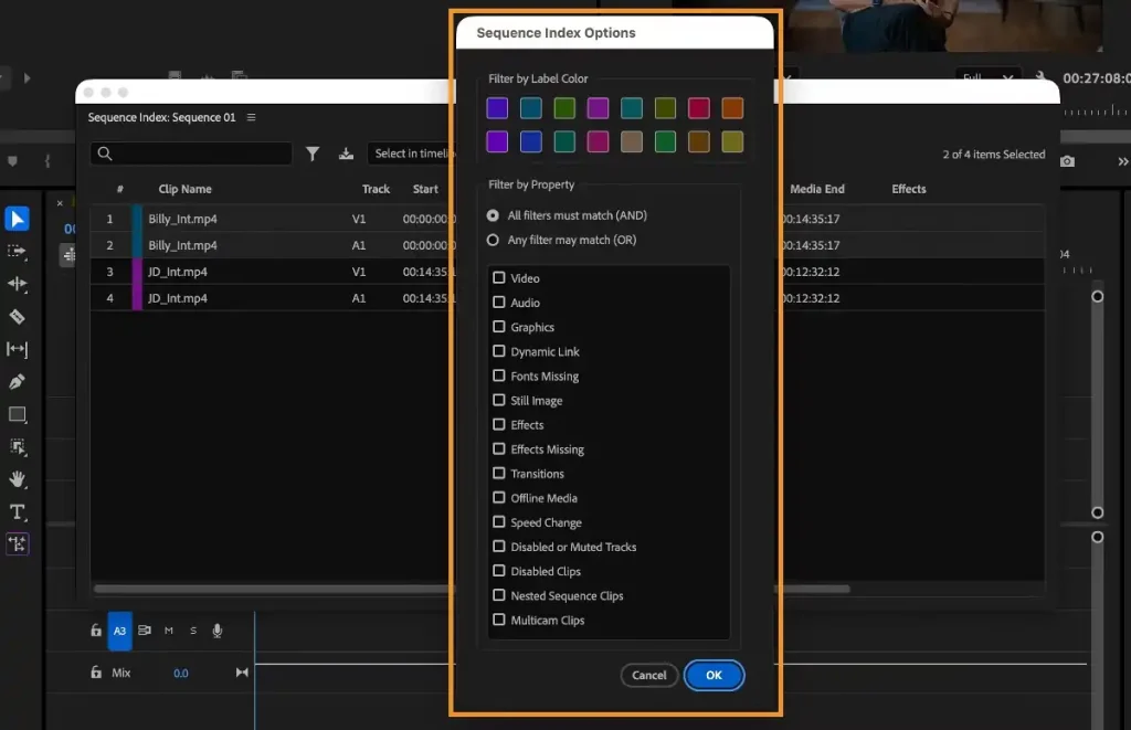 検索可能なスプレッドシート形式のレイアウトを備えた新しい「シーケンスインデックス」パネルにより、複雑なマルチトラックシーケンスでも、目的のクリップやエフェクト、問題箇所を素早く見つけられるようになりました。